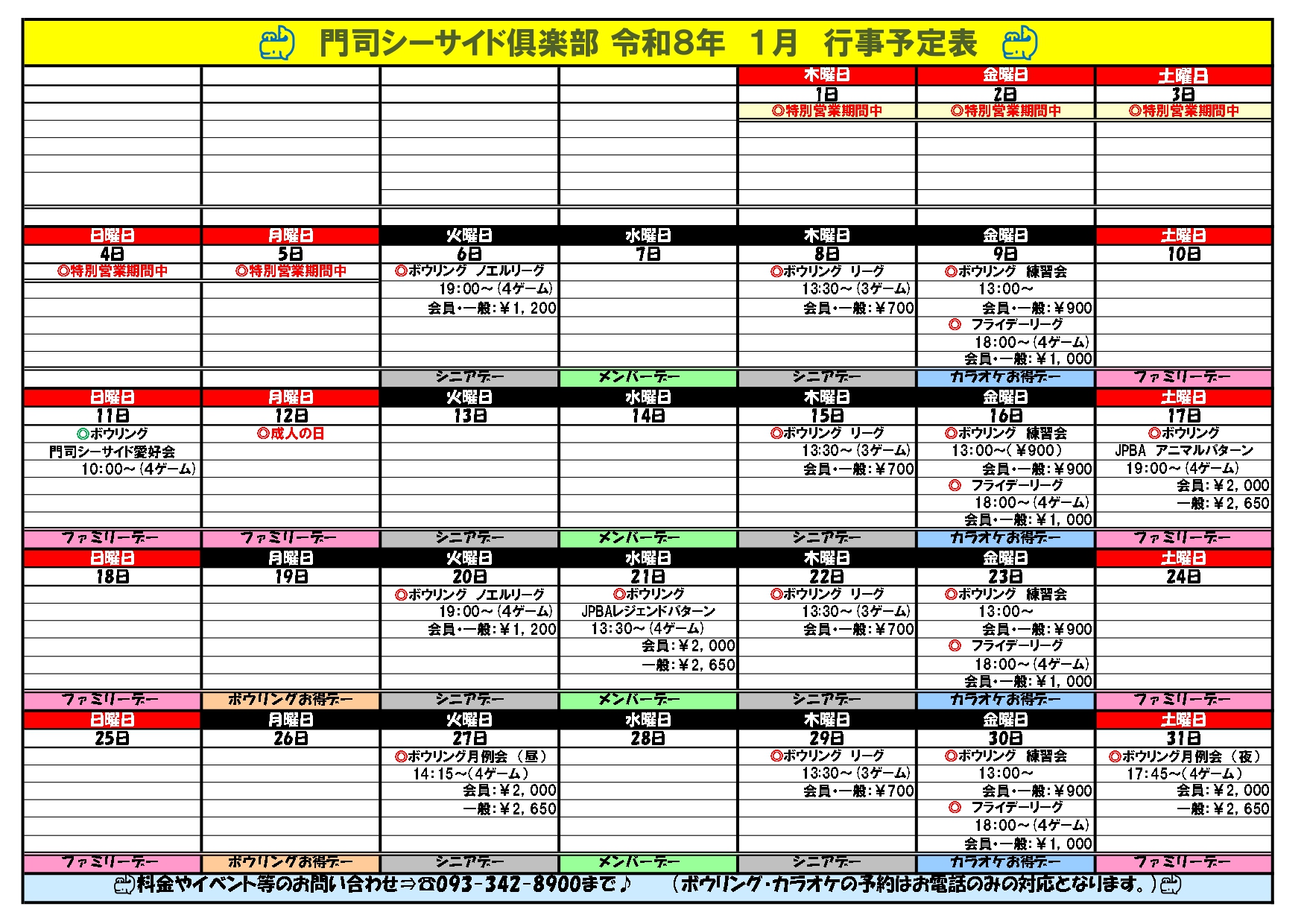 2026年1月のイベント表はこちらになります。 当店ご利用予定の際の確認にお役立て下さい。