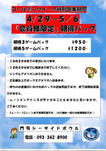 またゴールデンウィーク特別営業期間中限定の「ボウリング朝得パック」もあわせてご案内させていただきます。