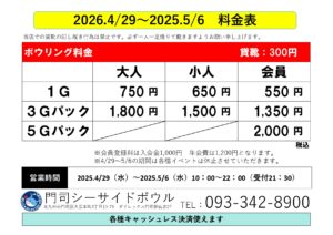 ボウリング・カラオケ共に以下の期間がゴールデンウィーク特別営業期間となっております。